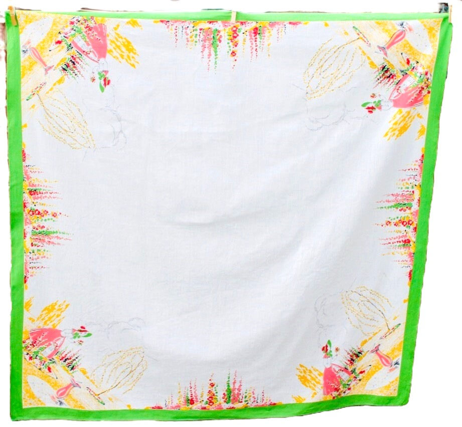Preloved Printed Lady in the Garden Floral Tablecloth, Lady in Flower Tablecloth