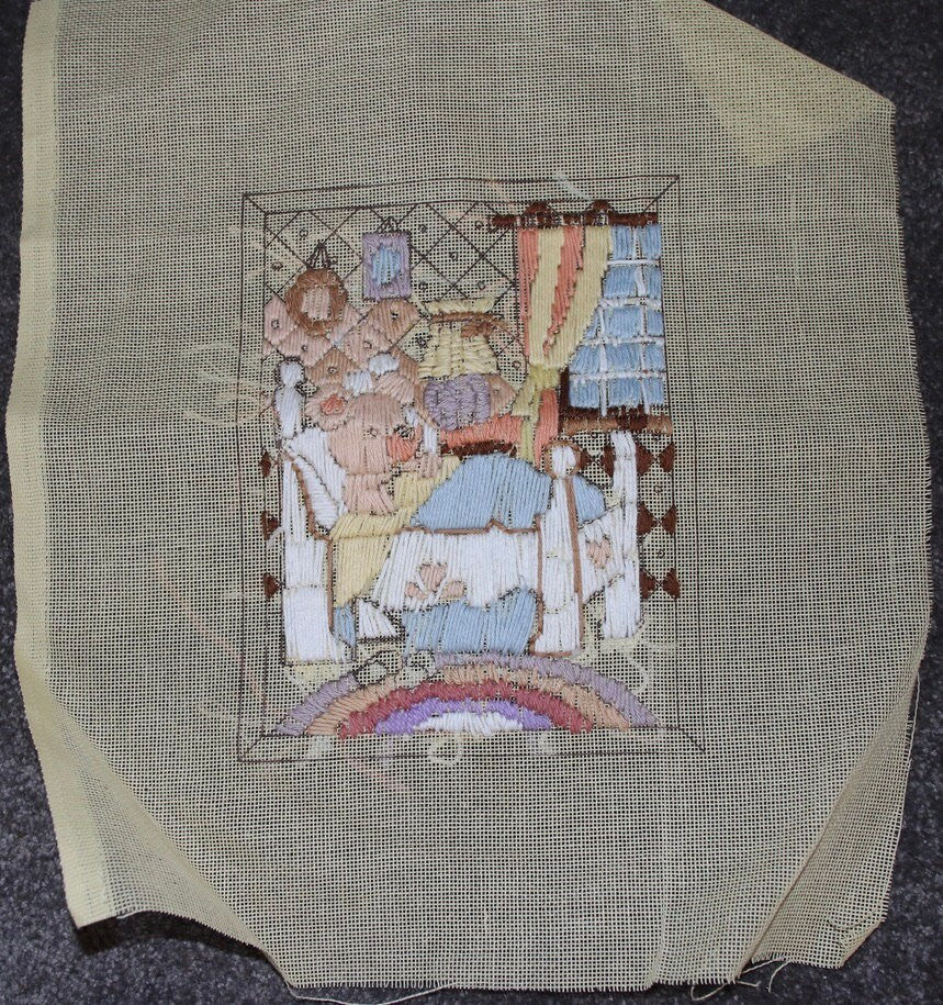 Preloved Teddy Bear in Bed Longstitch, Partially Complete
